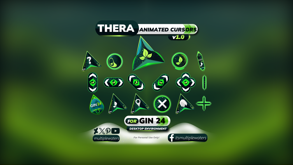 Thera Animated Cursors is a unique cursor scheme created to enhance your desktop experience. It was made to complement the GIN 24 desktop environment created by niivu on DeviantArt and as such the colors of Thera comes from the palette of GIN 24 project. This cursor set includes 17 fully animated cursors ready to add a touch to your desktop experience.